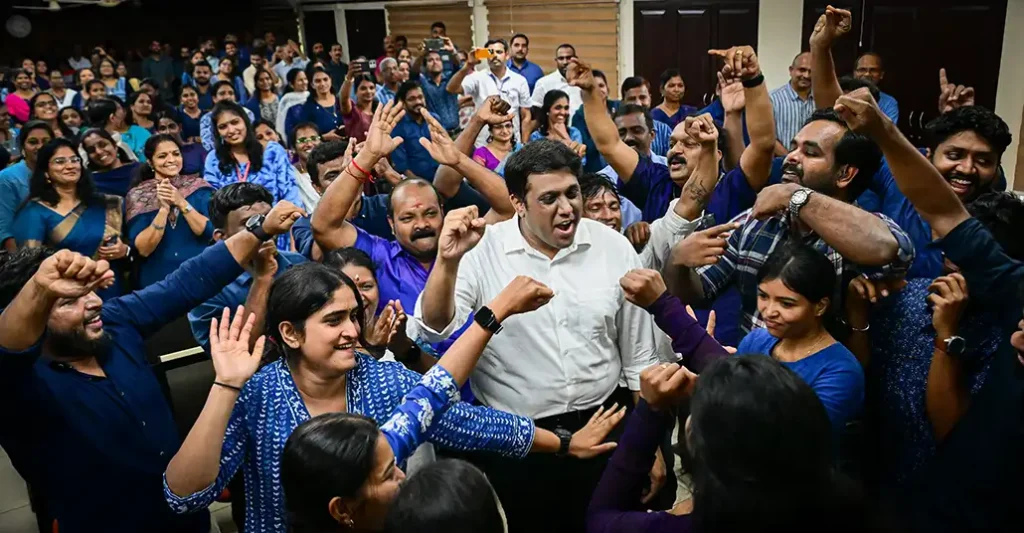 Collectorate staff give an enthusiastic send-off to N.S.K. Umesh as he steps down from the post of District Collector to take charge as Director of Education.