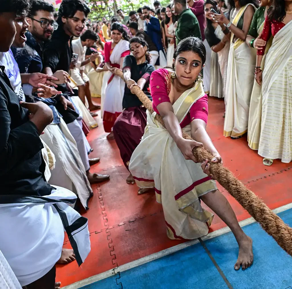 Kochi city schools were vibrant with Onam celebrations. A tug-of-war competition at Sacred Heart College, Thevara, on the last day before the Onam holidays.